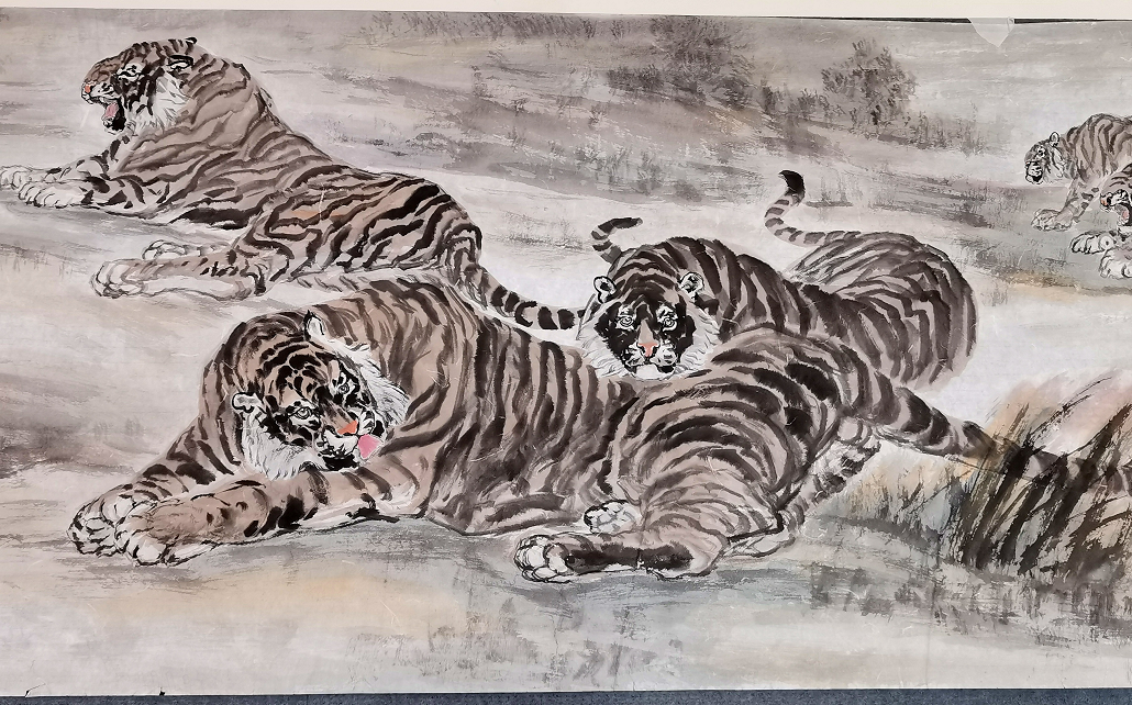 著名画家冯大中发表讲话,他阐明艺术要为政治服务、为社会服务。他盛赞百虎图创意好,构思好,气势好,很有意义。他说这一举动可贺可赞,画百虎,扬国威,彰显了画家们的雄心壮志。
