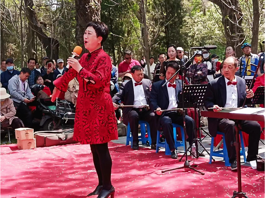 孙占超表演的京胡独奏《迎春》、孔庆山演唱的《骏马奔驰保边疆》、赵妍演唱的《桃花红杏花白》、牛玉秀表演的独唱《最美还是我们新疆》、李景林 梁平表演的男女声对唱《咱老百姓》、孟歌表演的女声独唱《俺是公社饲养员》、侯艳、赵妍表演的女声二重唱《洪湖水浪打浪》、唐永梅表演的独唱《我爱你中国》等,歌声、乐曲声,声声入耳,醉润心田,并吸引了越来越多的游人从四面八方赶来,演出现场被观众围得里外多层,密密麻麻,但现场秩序井然,时时响起热情的掌声和喝彩声。